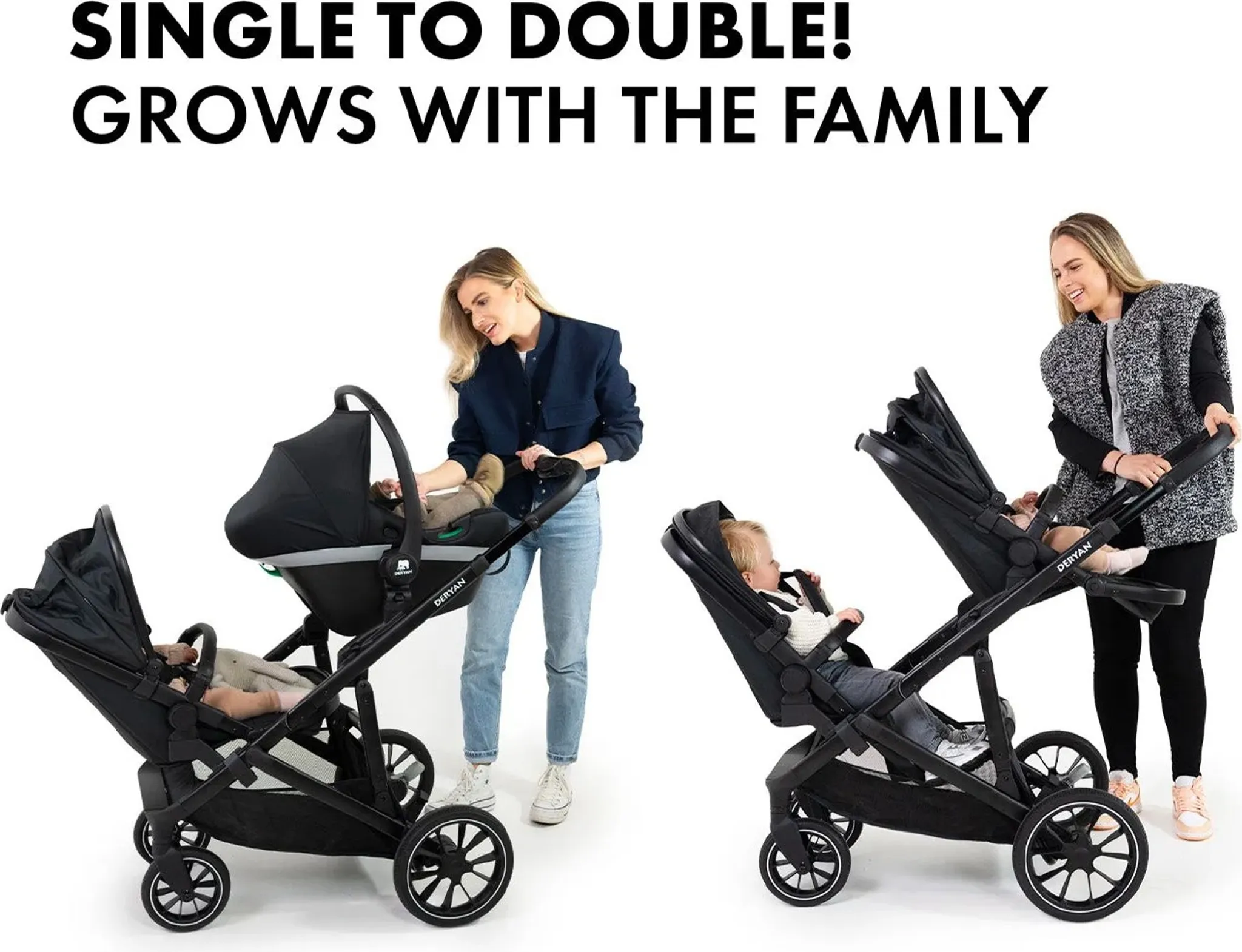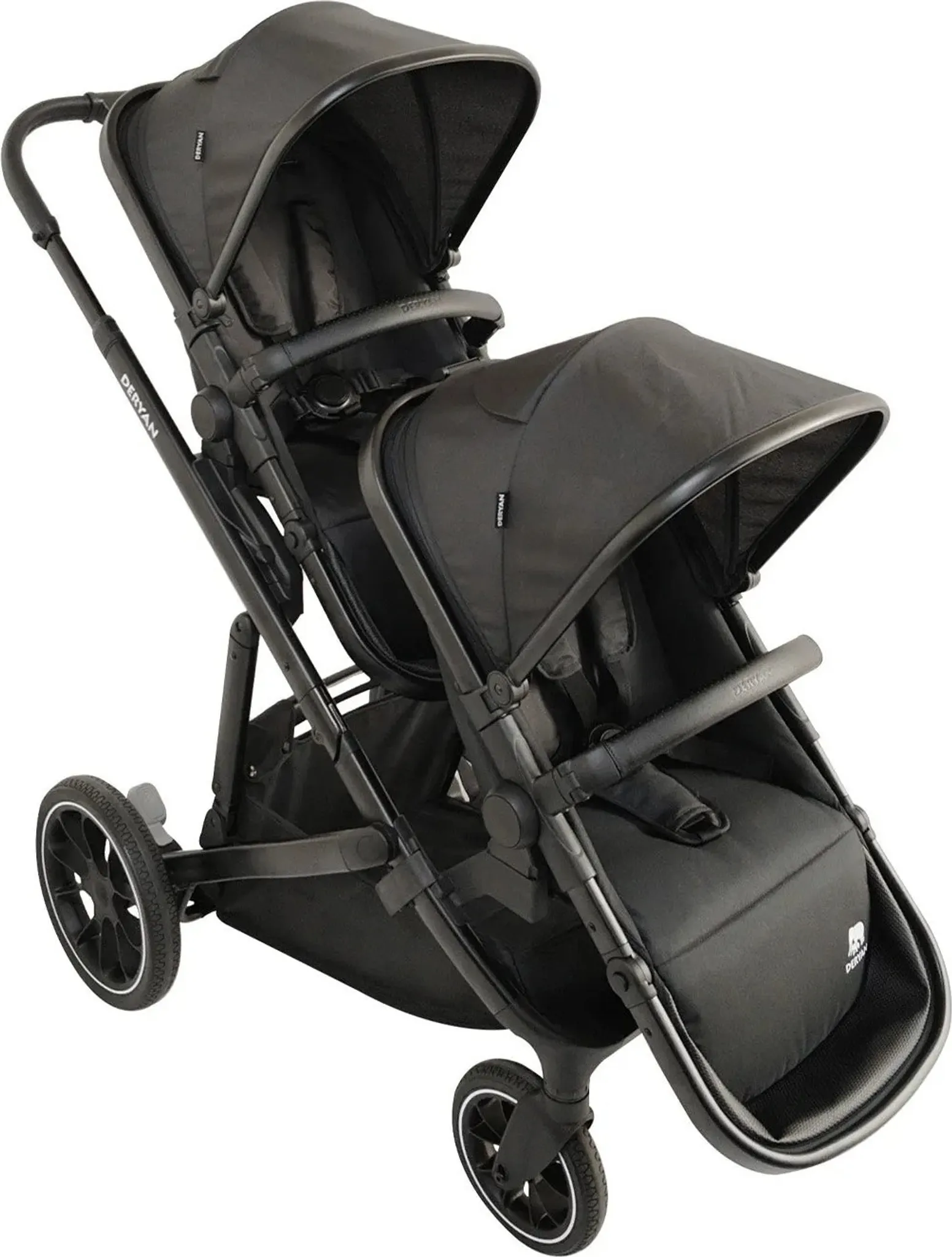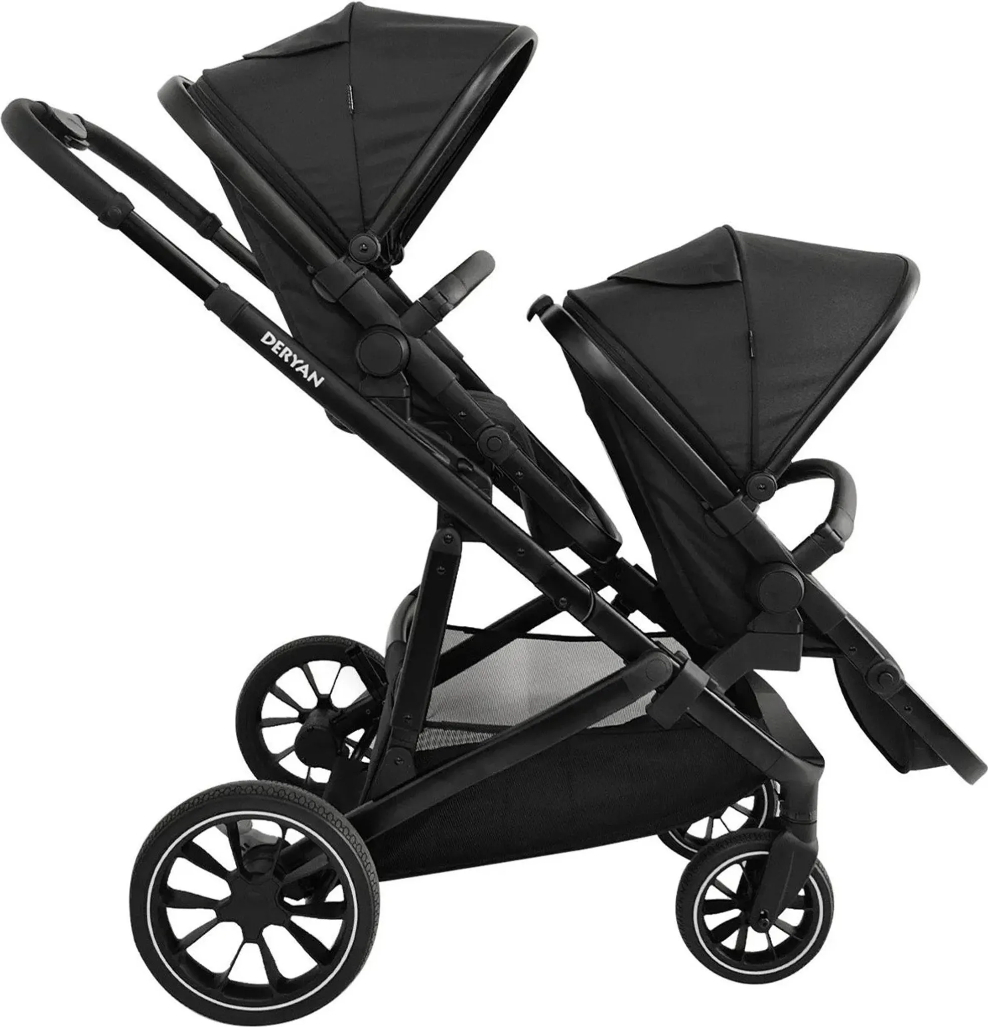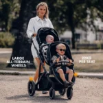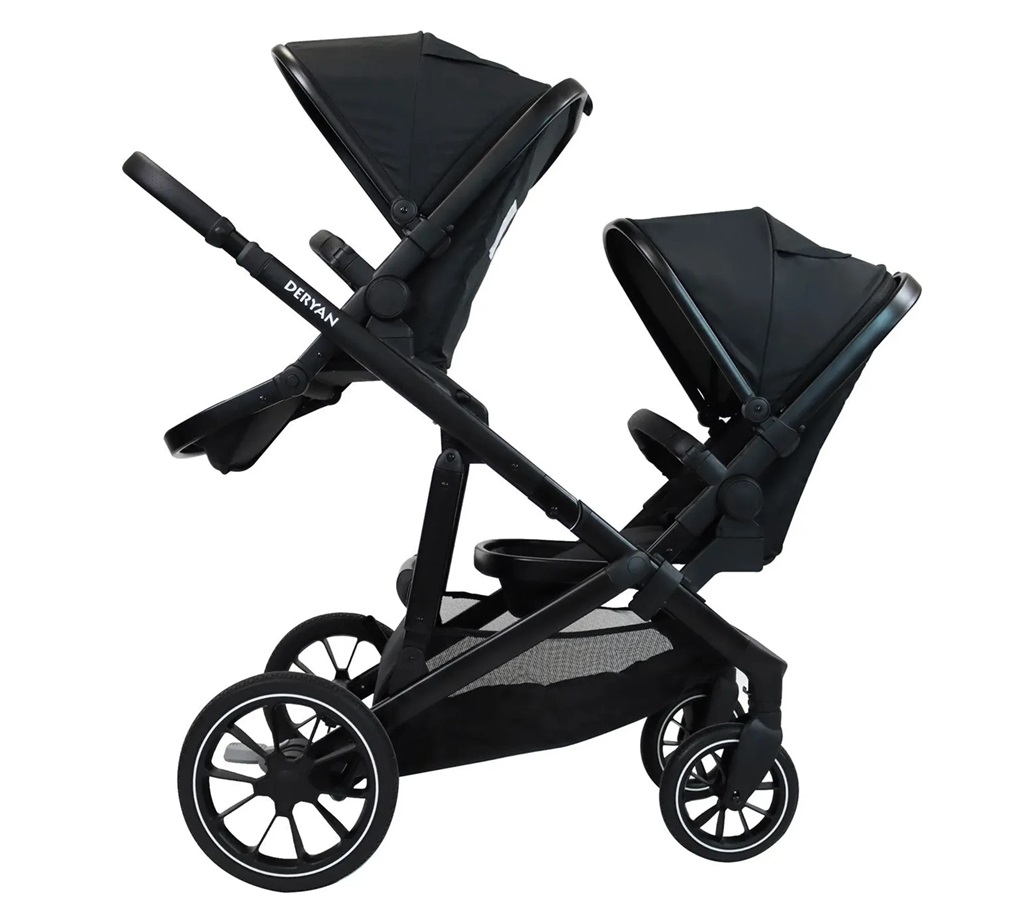 DERYAN Evy V2 Kinderwagen – Zwillingswagen – Erweiterbar – Inklusive Extra-Sitz – Schwarz