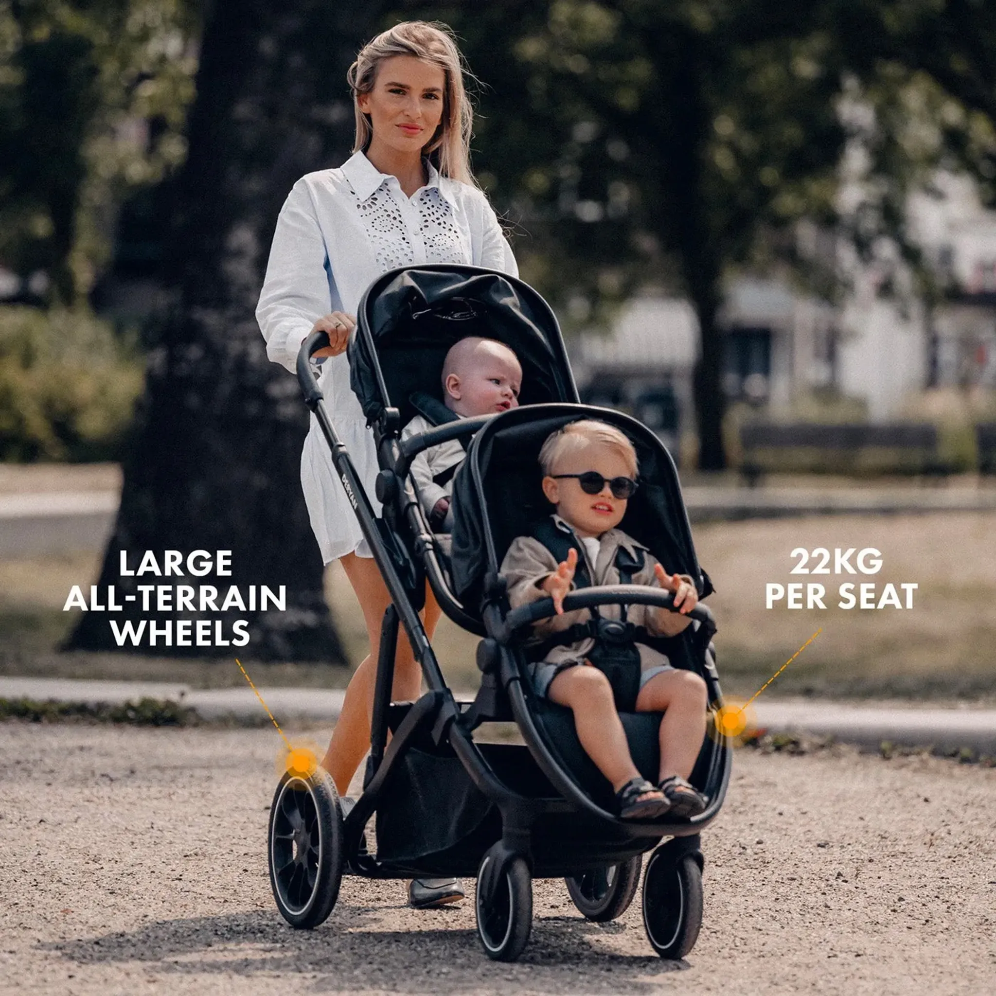Der DERYAN Evy Kinderwagen bietet Platz für zwei Kinder. Der Kinderwagen wird mit zwei Sitzen geliefert!