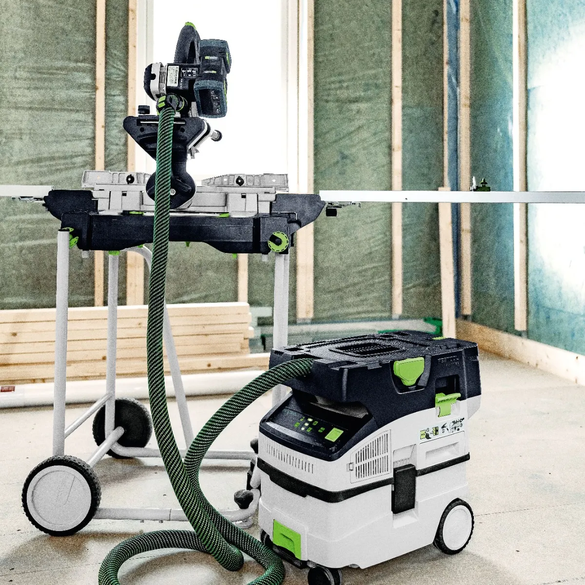 Ein System mit perfekt aufeinander abgestimmten Komponenten liefert exzellente Ergebnisse unter optimalen Bedingungen und in einer gesünderen Umgebung. Bessere Bedingungen: Sägeblätter für jede Anwendung – und dank Drehzahlvorwahl eine perfekt auf das Material abgestimmte Drehzahl – sowie ein Neigungswinkelmesser zum direkten Übertragen von Innen- und Außenwinkeln. Gesünderes Arbeitsumfeld: Fahrgestell mit Rollen für eine ergonomische Arbeitshaltung und einfachen Transport sowie ein Staubfangsack für geringe Staubemissionen. Einfach praktisch: mit einem Akku-Akkupack und Ladegerät, die alle ordentlich im Systainer³ verstaut sind.