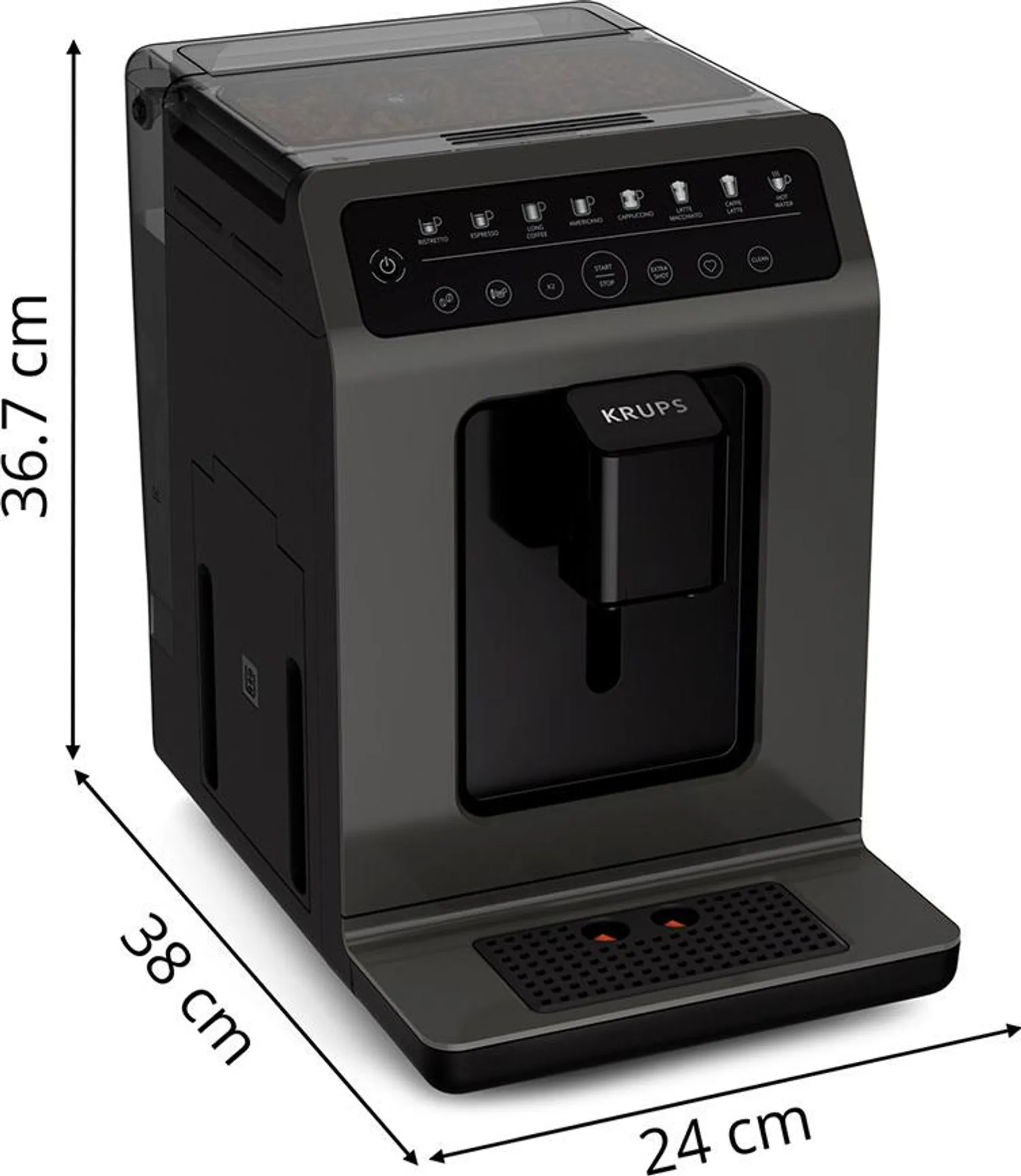 - 8 verschiedene Getränkevariationen im Direktbezug auf Knopfdruck: Ristretto, Espresso, Long Coffee (Kaffee), Americano, Cappuccino, Latte Macchiato, Café Latte, Heißwasser für Tee